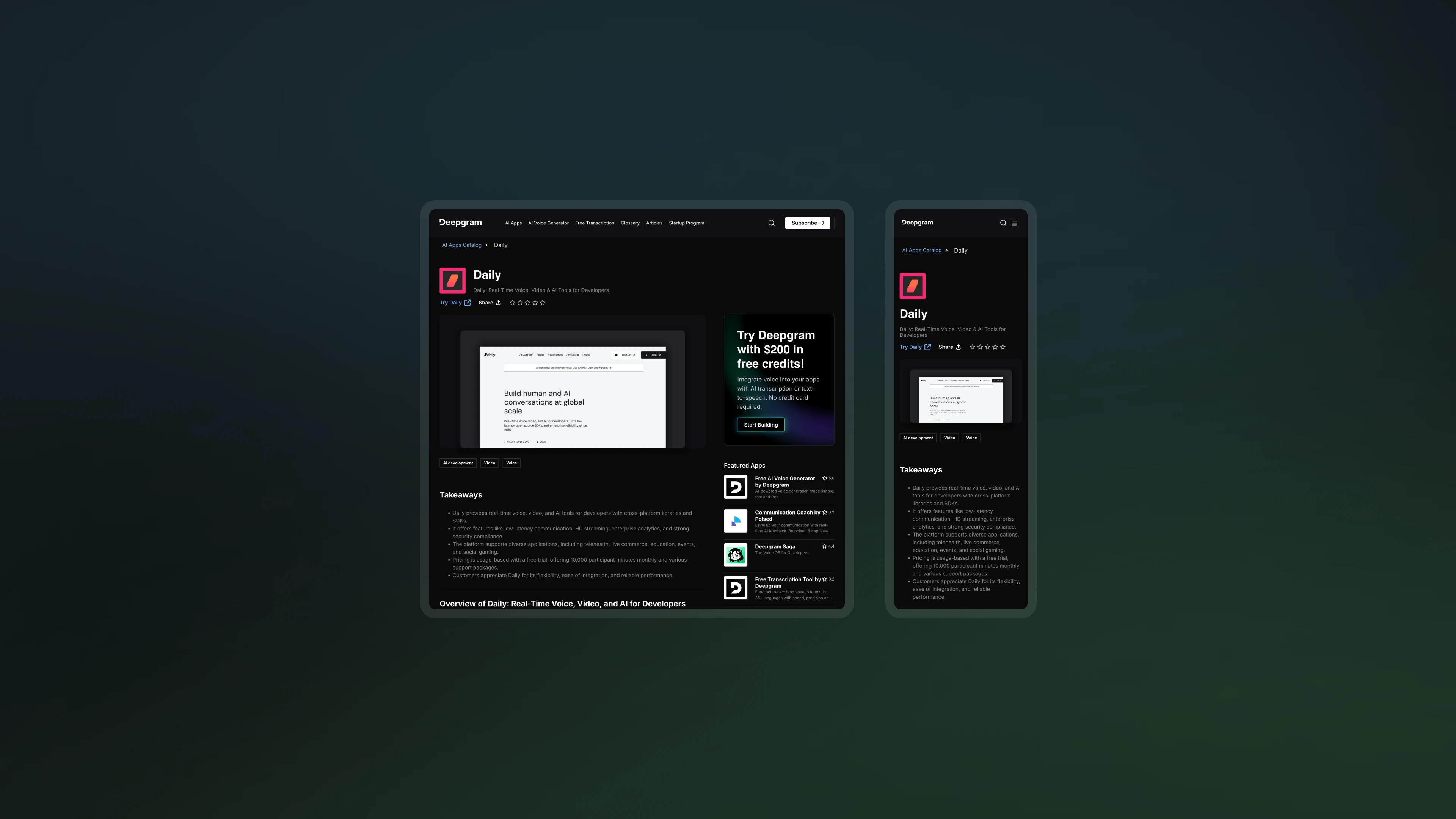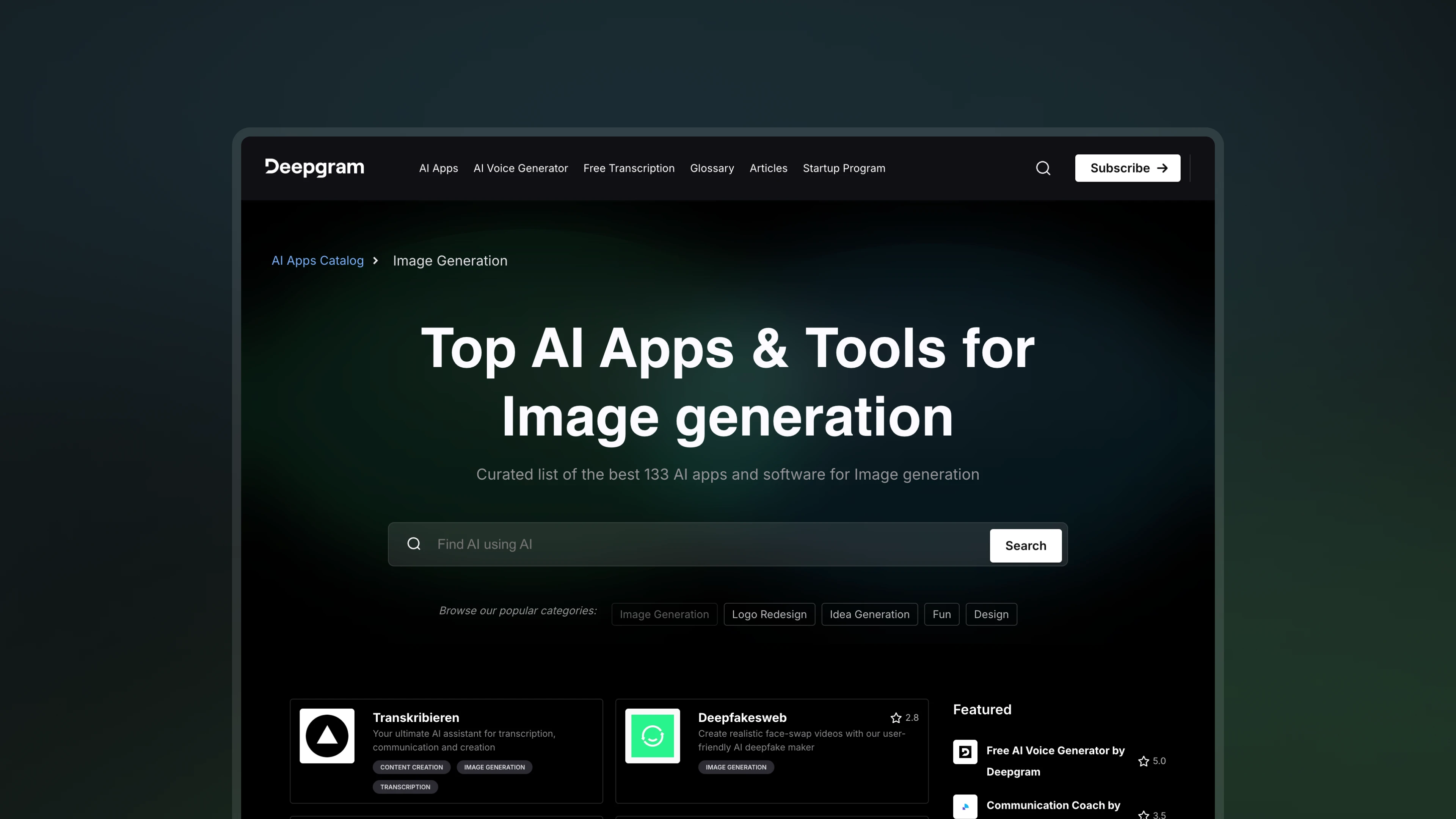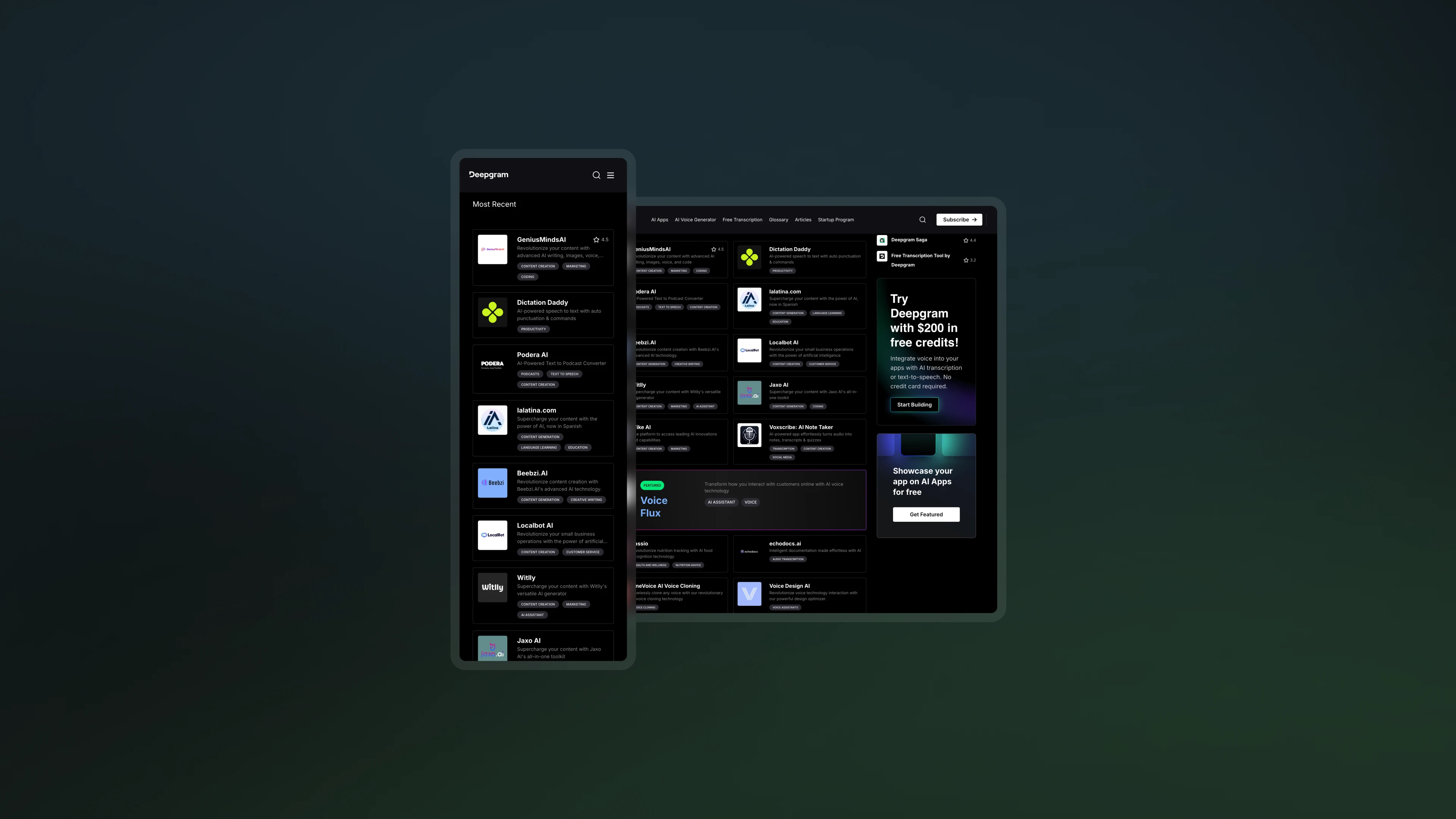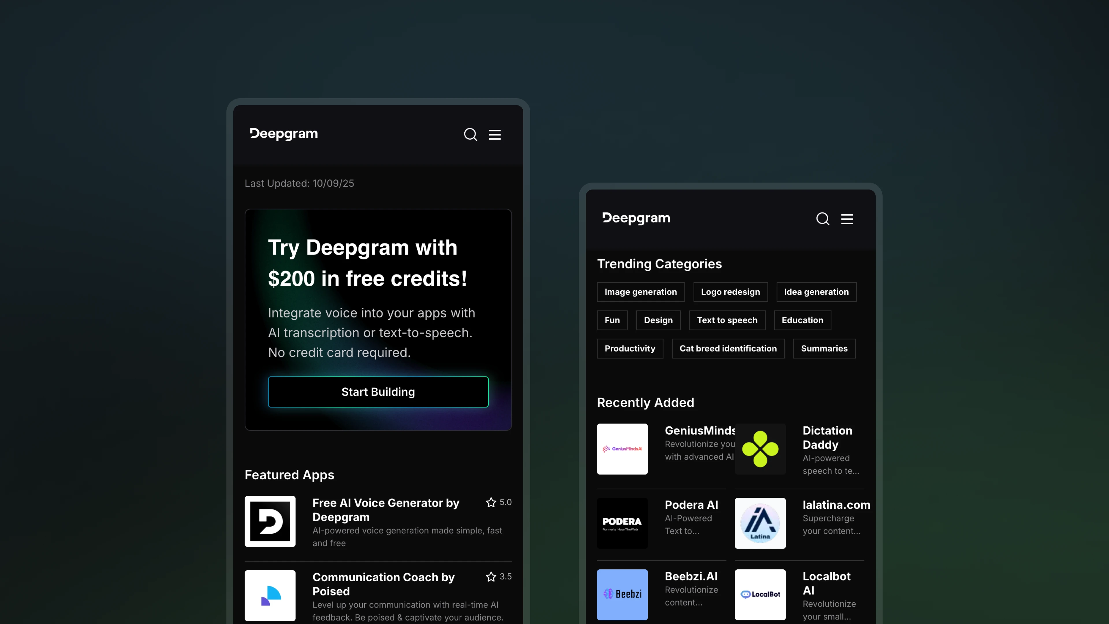 Deepgram, the voice-solutions expert that are known for the early usage of AI Speech-To-Text, Text-To-Speech, and Voice Agent APIs, was looking for a way to feature the rapid-growing catalog of AI-powered services in one place. There wasn’t necessarily a shortage of competitors trying to do this very same thing, but the results we found either had a poor search experience, didn’t give good explanations of what the services actually did, or were just plain frustrating to use. Using the authority in the AI space, we felt like Deepgram had the perfect voice to make this dream possible.